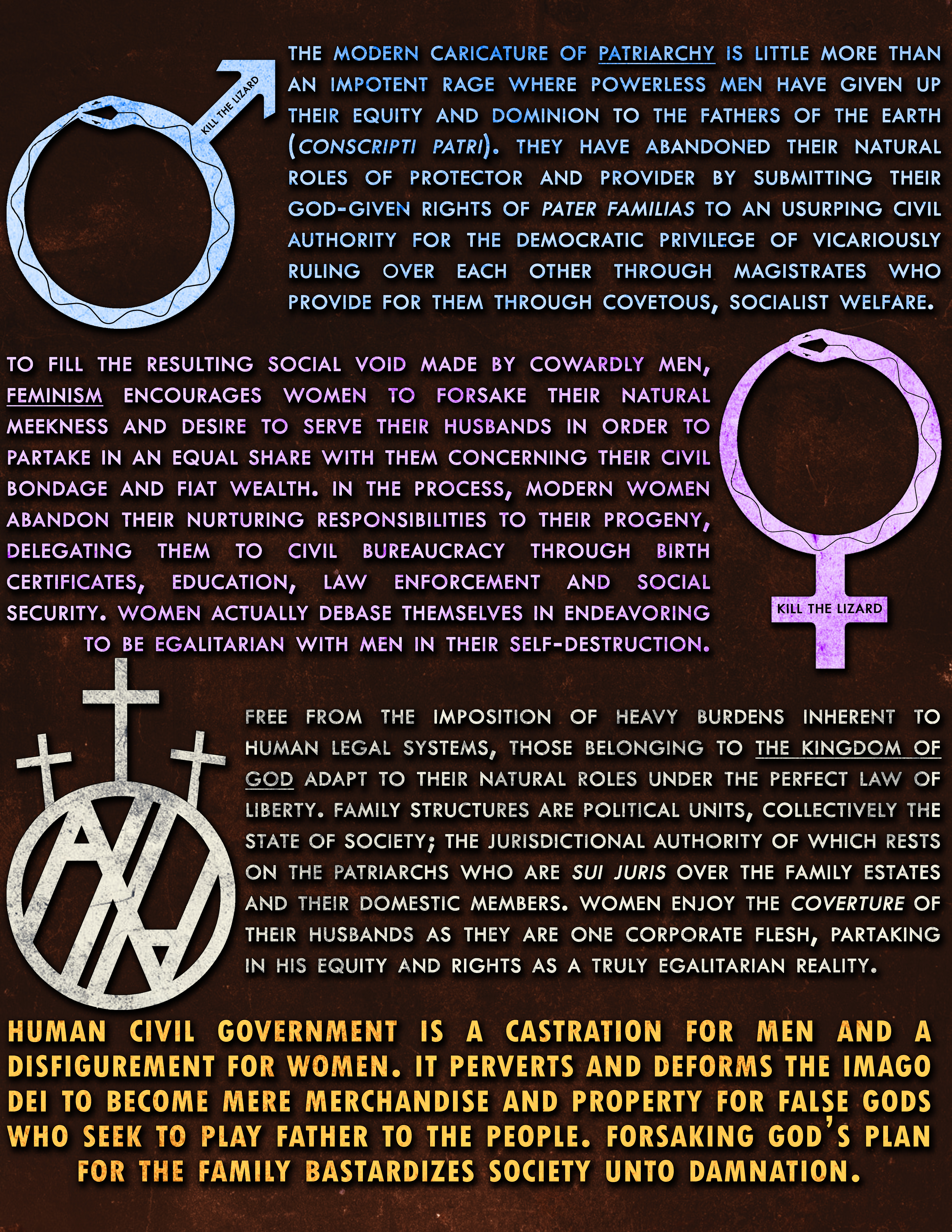 To pursue an egalitarian relationship, they have to become a legally separate person from their husbands, which means they are no longer one flesh with their husbands. They are no longer in matrimony, but are instead married under false gods, by the power invested by the municipality of wherever through an adulterous contract between three parties: the man, the wife, and the civil father that gives them away in marriage and incorporates their union. “Marriage is a civil contract to which there are three parties – the husband, the wife and the state.” (Appellate Court of Illinois, NO. 5-97-0108: Van Koten v. Van Koten. 154 N.E. 146.)