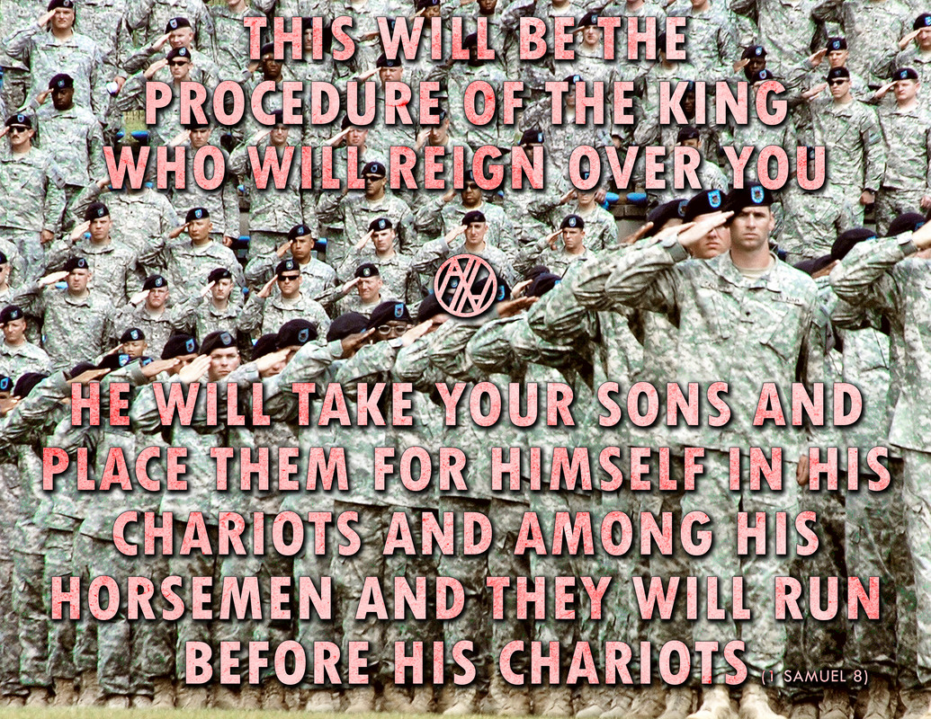 “And Samuel told all the words of the LORD unto the people that asked of him a king. And he said, This will be the manner of the king that shall reign over you: He will take your sons, and appoint them for himself, for his chariots, and to be his horsemen; and some shall run before his chariots. And he will appoint him captains over thousands, and captains over fifties; and will set them to ear his ground, and to reap his harvest, and to make his instruments of war, and instruments of his chariots…” (1 Samuel 8:10-12)
