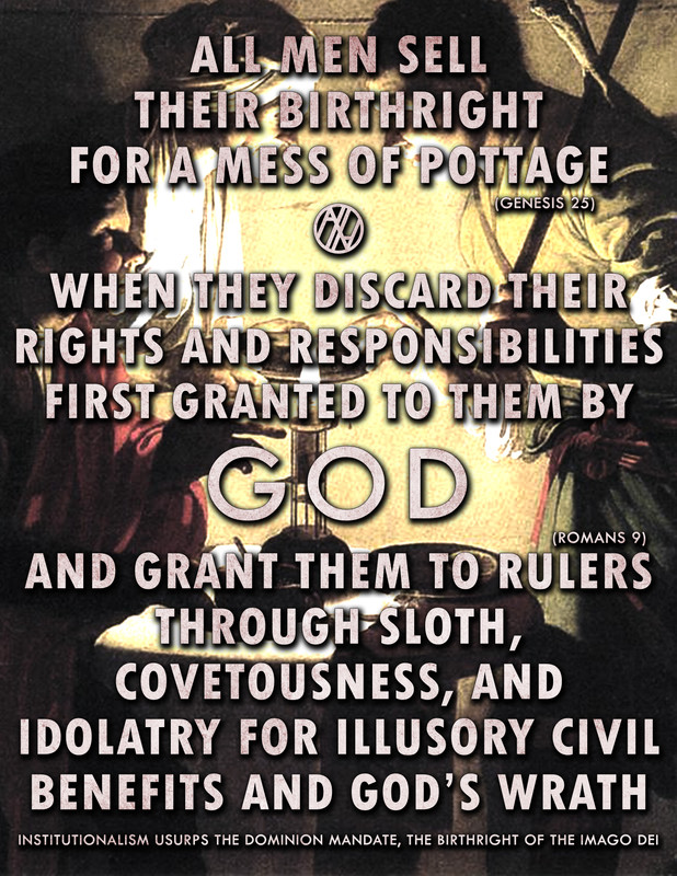 He strips his own inherent dignity from himself through sin, in order to pragmatically partake in the deceitful benefits of human civil government, where he can outsource his personal responsibility towards the Dominion Mandate to the capable bureaucracies of human civil government. He sells himself into bondage for a mess of pottage by selling his birthright. To reiterate in more legal terms, “Man is a term of nature; person of civil law.” (Bouvier’s Law Dictionary [1914], “Maxim,” p. 2136.) A Man is made in God’s image. A Person is made in the image of a false god, until he is born again in God’s image.