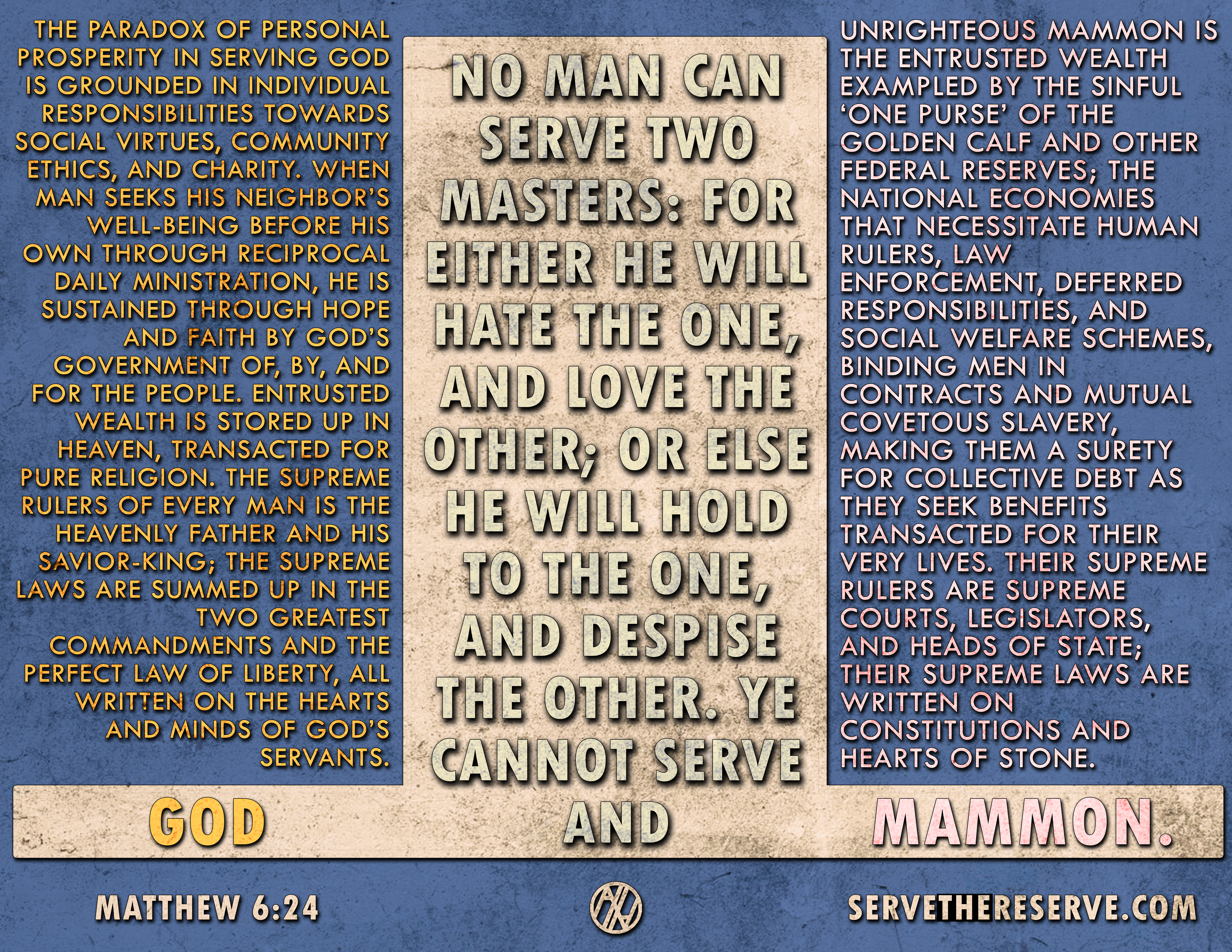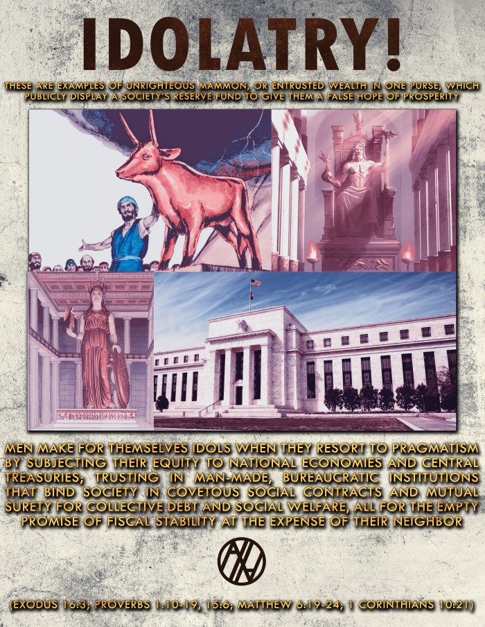 So, the term “Unrighteous mammon” does not merely refer to a common storehouse of wealth, but also to the idolatrous institutions that are necessarily made when the people entrust their real wealth (like gold, silver, labor, equity, real estate, and children) into the bureaucracies created by national treasuries, societal depositories, and reserve funds maintained by men of government.