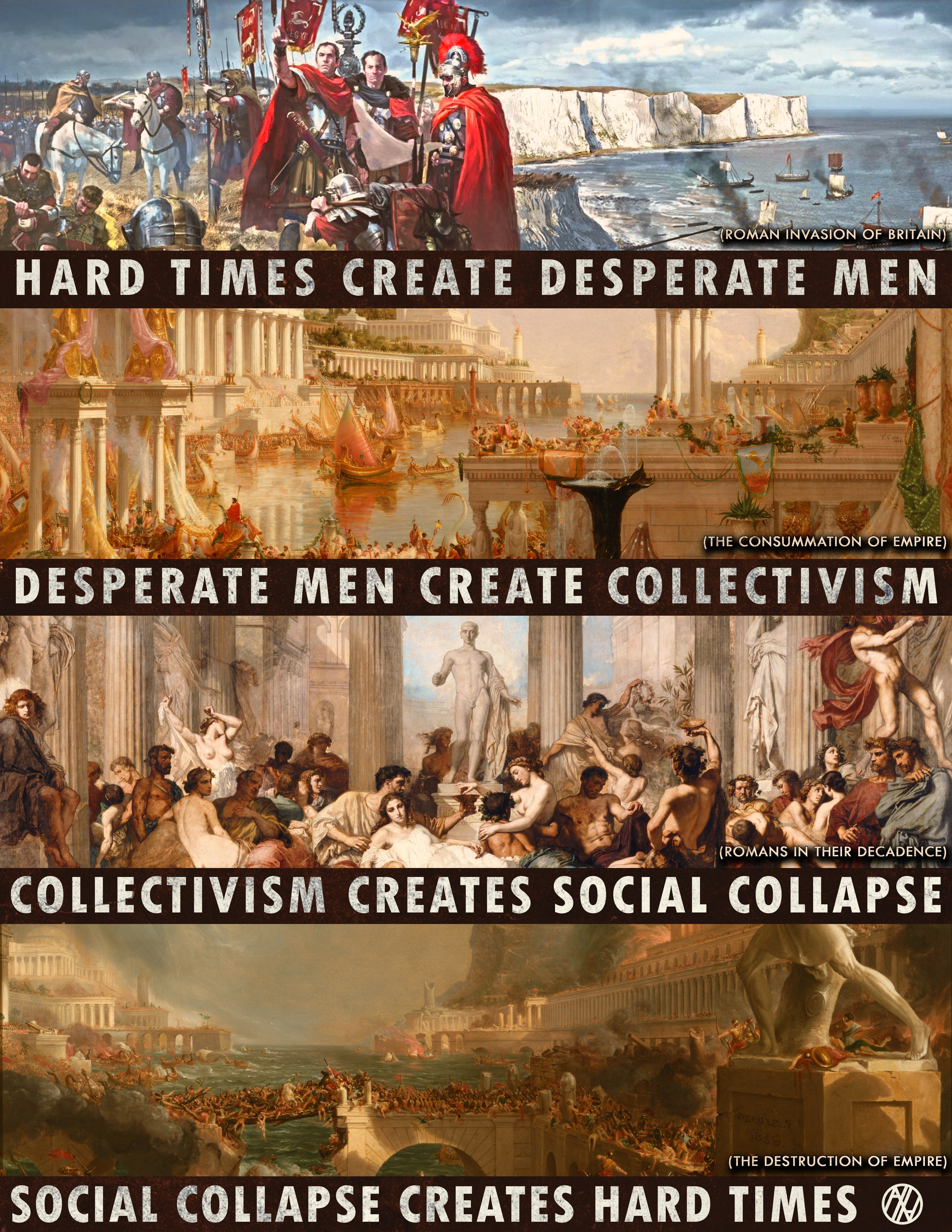 Everyone must be accountable for each other, through protection and provision, to stay and fight off intruders for each other, because running away meant they would be abandoning the wealth they invested into this socialist way of life. They can’t “leave the system” because they are “entitled to its benefits.” This is the same excuses people make to continue receiving covetous social security benefits because they already paid in to the administration. Their continued involvement and participation double down in securing their investment, and society evolves beyond the initial establishment of just a bank.