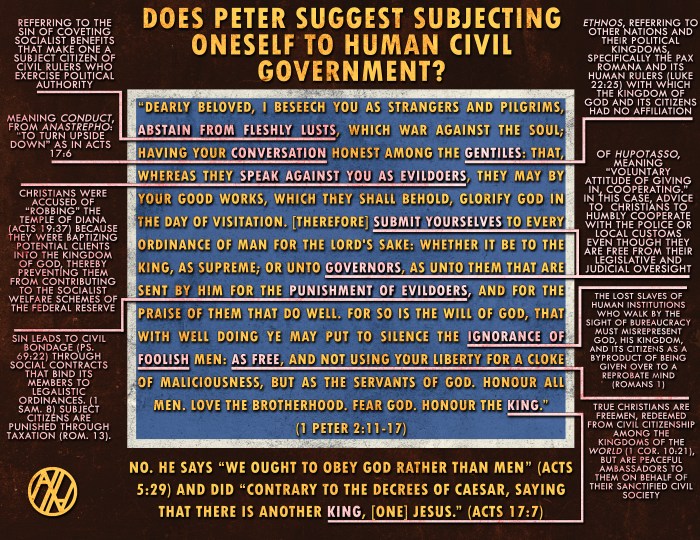 With this history and exegesis serving as a backdrop, it would be beneficial to examine just what Peter means when he tells his audience to submit themselves “to every ordinance of man… unto governors” who are “for the punishment of evildoers.” Surely, if Peter was known for doing “contrary to the decrees of Caesar,” because He had “another king, one Jesus,” then this concept of submitting to governors and human ordinances must mean that he was inconsistent in advocating that Christians attempt to serve two masters.