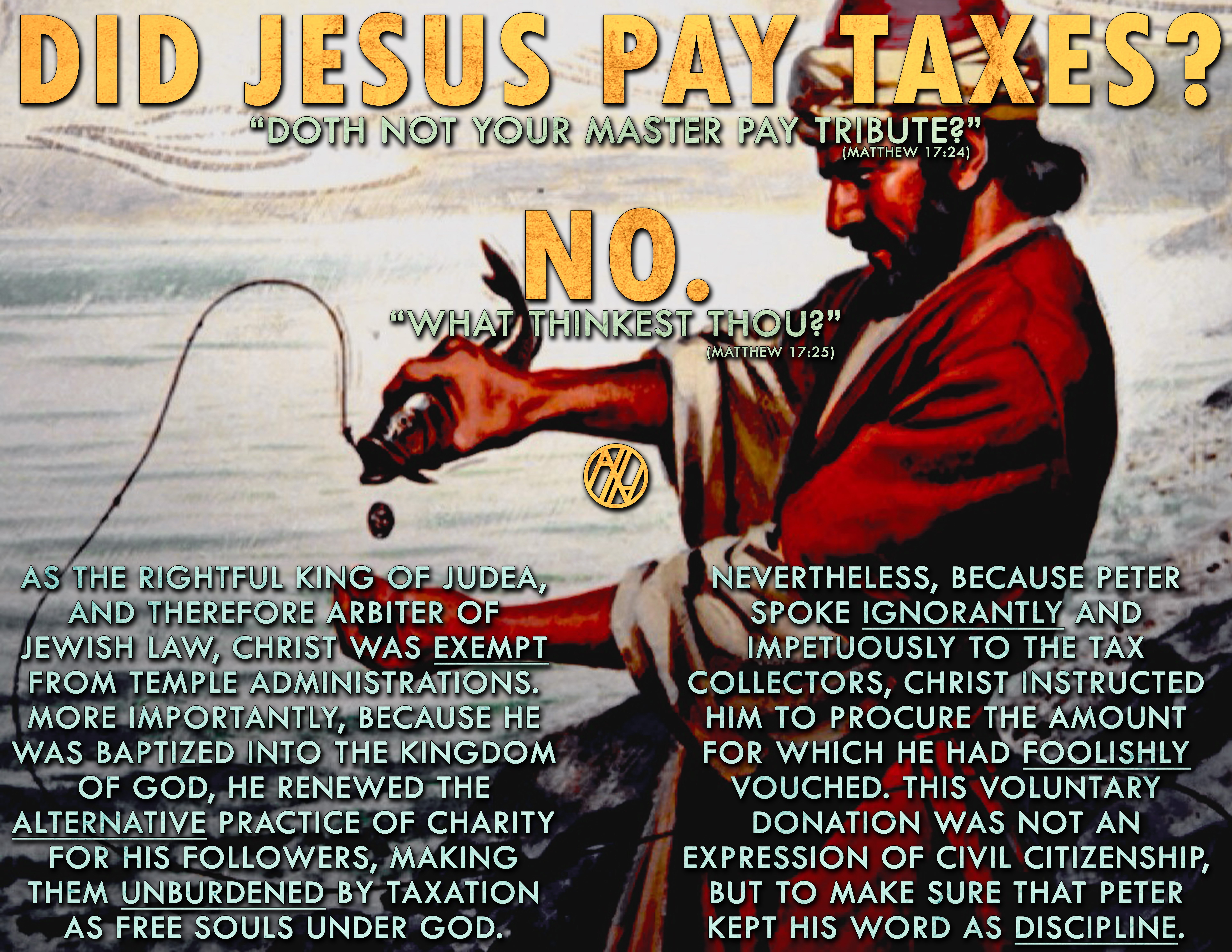 “And when they were come to Capernaum, they that received tribute money came to Peter, and said, Doth not your master pay tribute? He saith, Yes. And when he was come into the house, Jesus prevented him, saying, What thinkest thou, Simon? of whom do the kings of the earth take custom or tribute? of their own children, or of strangers? Peter saith unto him, Of strangers. Jesus saith unto him, Then are the children free. Notwithstanding, lest we should offend them, go thou to the sea, and cast an hook, and take up the fish that first cometh up; and when thou hast opened his mouth, thou shalt find a piece of money: that take, and give unto them for me and thee.” (Matthew 17:24-27)