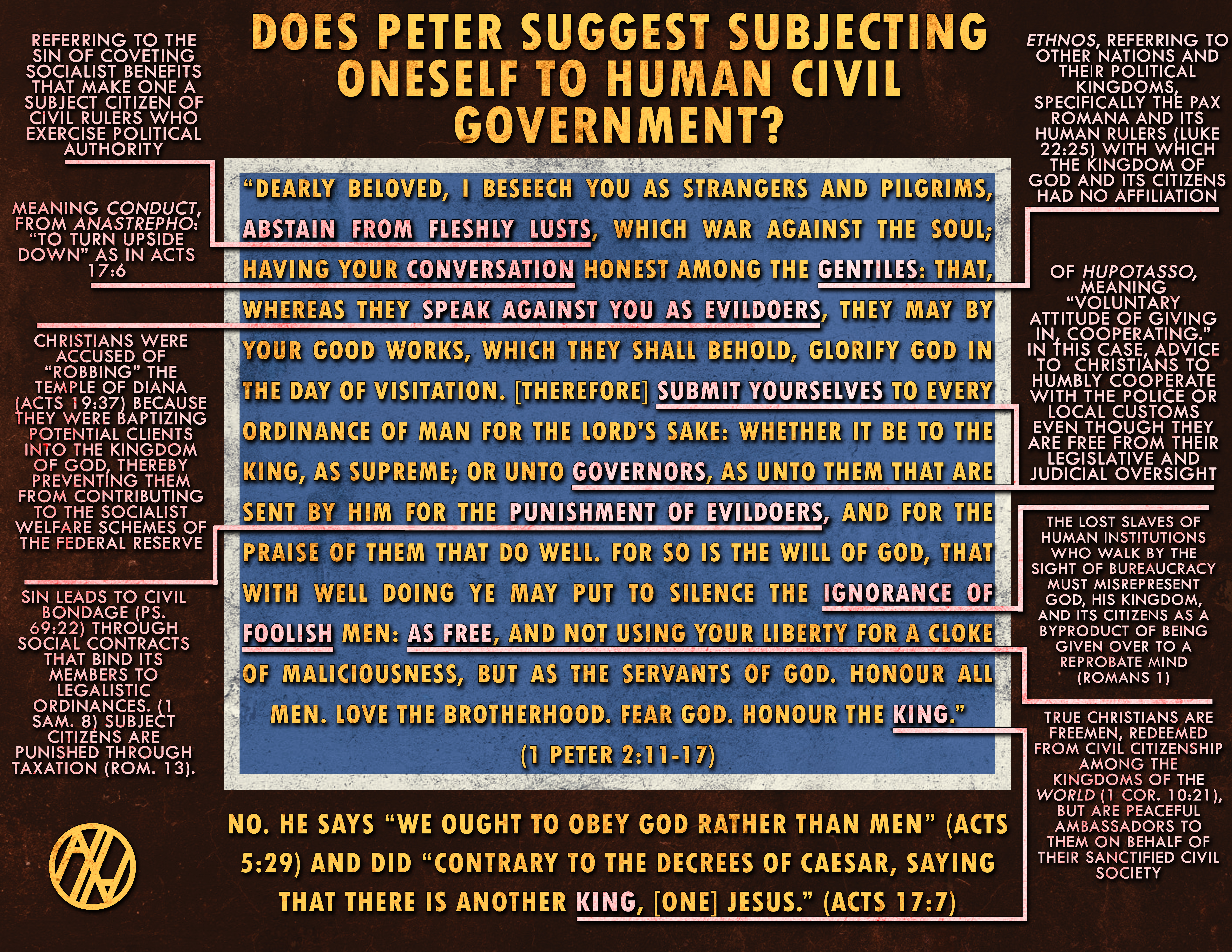 Even though the beginning of this chapter describes Peter’s audience as “disallowed of men” (as in cast out from their civil societies), “lively stones” in a “spiritual house” as a “holy priesthood, to offer up spiritual sacrifices” (as opposed to hewn stones in a carnal, worldly jurisdiction, as civil slaves, who give up forced sacrifices through taxation), a “chosen generation” (as in a nation of one kind of people), a “royal priesthood, an holy nation” (as in a kingdom of priests, freed from former civil slavery), “a peculiar people” (which will be examined shortly) who have been called out “of darkness into his marvellous light” (left the civil jurisdictions of the world to enter the Kingdom of God), those contentious against the Gospel of God still use this passage to legitimize going under the power of human civil government.