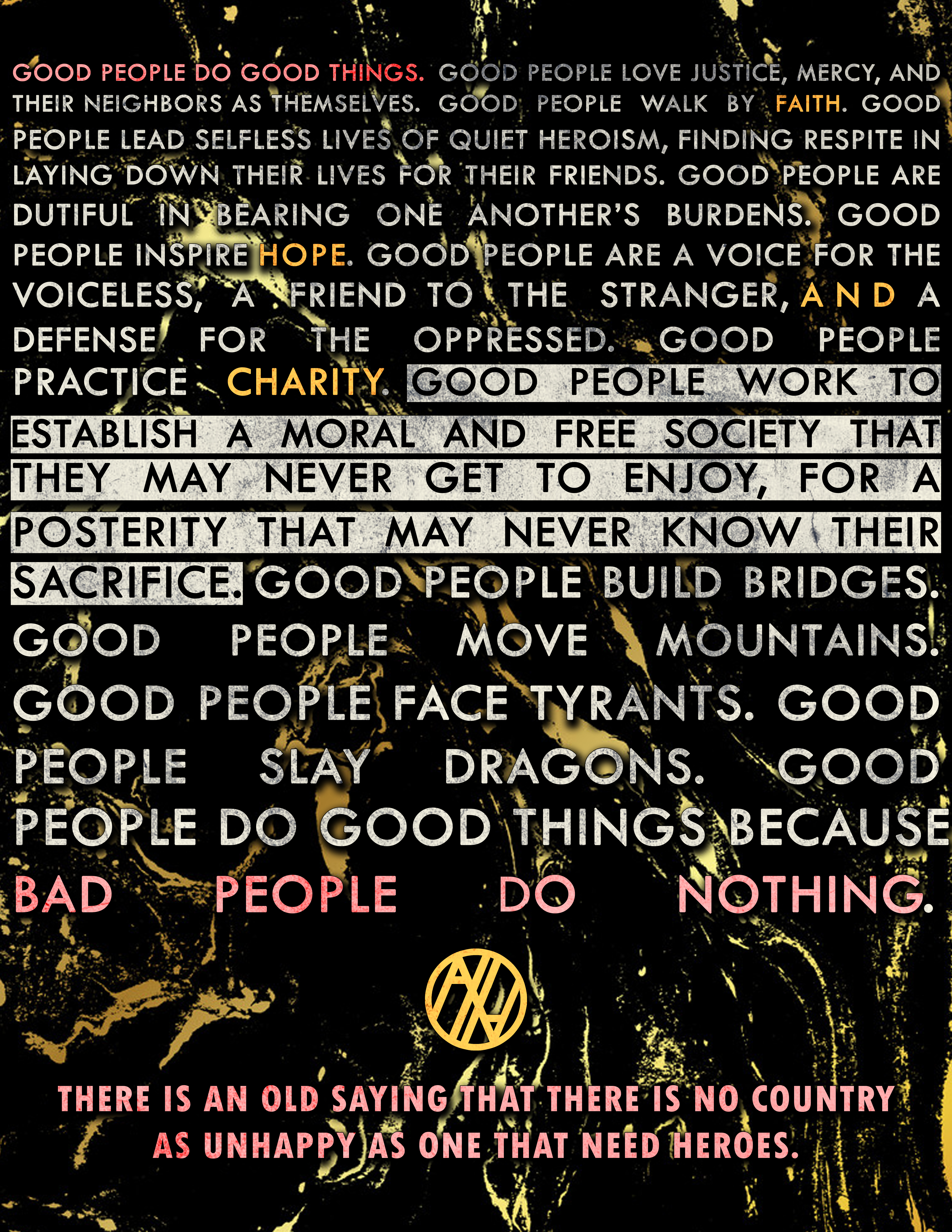 I do not believe everybody was cut out to be a leader, but I do believe everybody is meant to be in a progressive state of self-actualization. Tenaciously heroic, if you will. At least in their own social circles. A sincere life is one hard-led, especially in a society that calls for banality and cocktail parties. “There is an old saying that there is no country as unhappy as one that needs heroes.” (Beagle) Being an example is a daily, personal struggle, and as Carl Sandburg says, “Valor is a gift. Those having it never know for sure whether they have it till the test comes. And those having it in one test never know for sure if they will have it when the next test comes.” Maybe the key to a life marked by bravery is persistence. One thing that can be said about the dogged is that their epitaphs are never written in lies or embellishments; their histories are available for everybody to see, are they not? Everything on the table. In order to achieve our desired reputation we cannot take our aphorisms for granted. We must refresh their meanings from the perspective of every available human experience, whether it be true or fictional, anticipated or biographical. “As a single footstep will not make a path on the earth, so a single thought will not make a pathway in the mind. To make a deep physical path, we walk again and again. To make a deep mental path, we must think over and over the kind of thoughts we wish to dominate our lives.” (Thoreau)