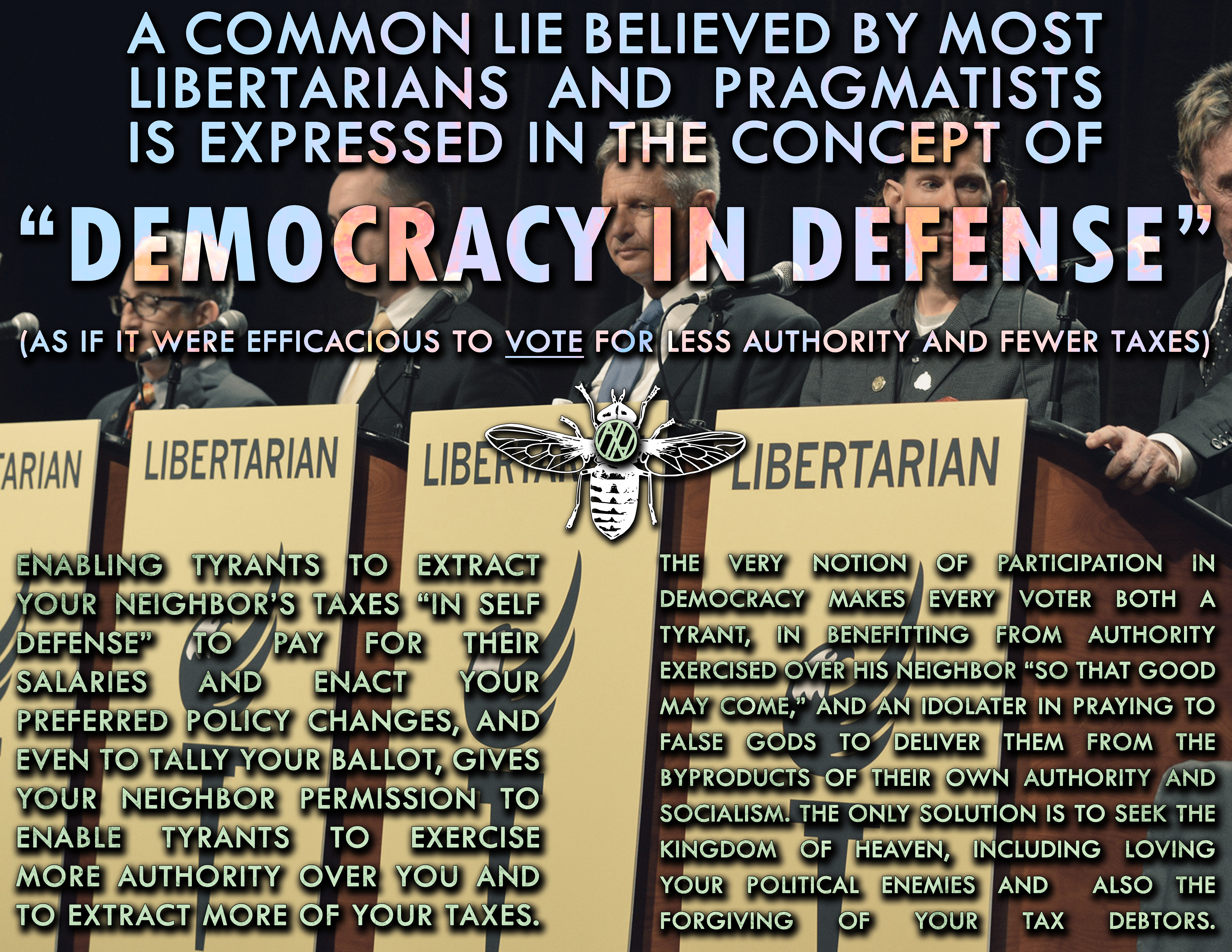 In light of these facts, it should be concluded explicitly that an endeavor like the Libertarian Party, or other theonomist and reconstructionist schemes, are evil. Their proponents know they are evil, and this fact is not absent from their tickets. Anybody who supports, donates to, pledges to vote for members of these parties, or involve themselves in peripheral political action committees, all invariably agree that they belong to the “lesser evil,” and so cannot deny being evil.