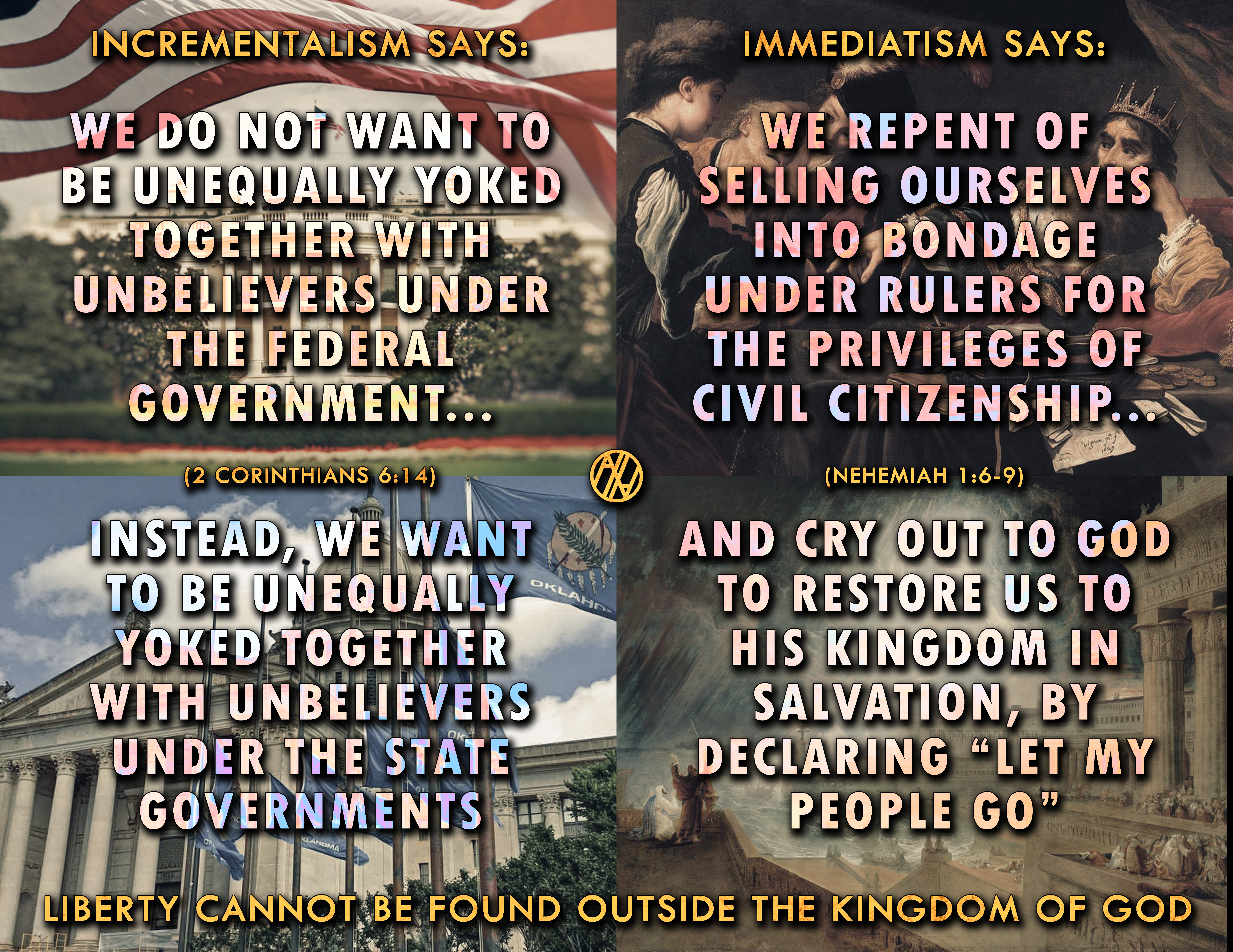 The Constitution of the Kingdom of Heaven, as given to Moses after the liberation of the Israelites from Egyptian civil citizenship, is a framework for Immediatism to strengthen and nourish their freedom and the freewill bonds of their new, political association. That constitution, expressed in the Ten Commandments declares that it is immediatist to say “Thou shalt have no other gods before me.” It is incrementalist to say “Give us a king to judge us.” It is immediatist to say “Thou shalt not make unto thee any graven image… or bow down thyself to them, nor serve them.” It is incrementalist to say “allow us to make a golden calf out of our collective wealth, forming a central bank to prop up socialist institutions that compel our service to them.“