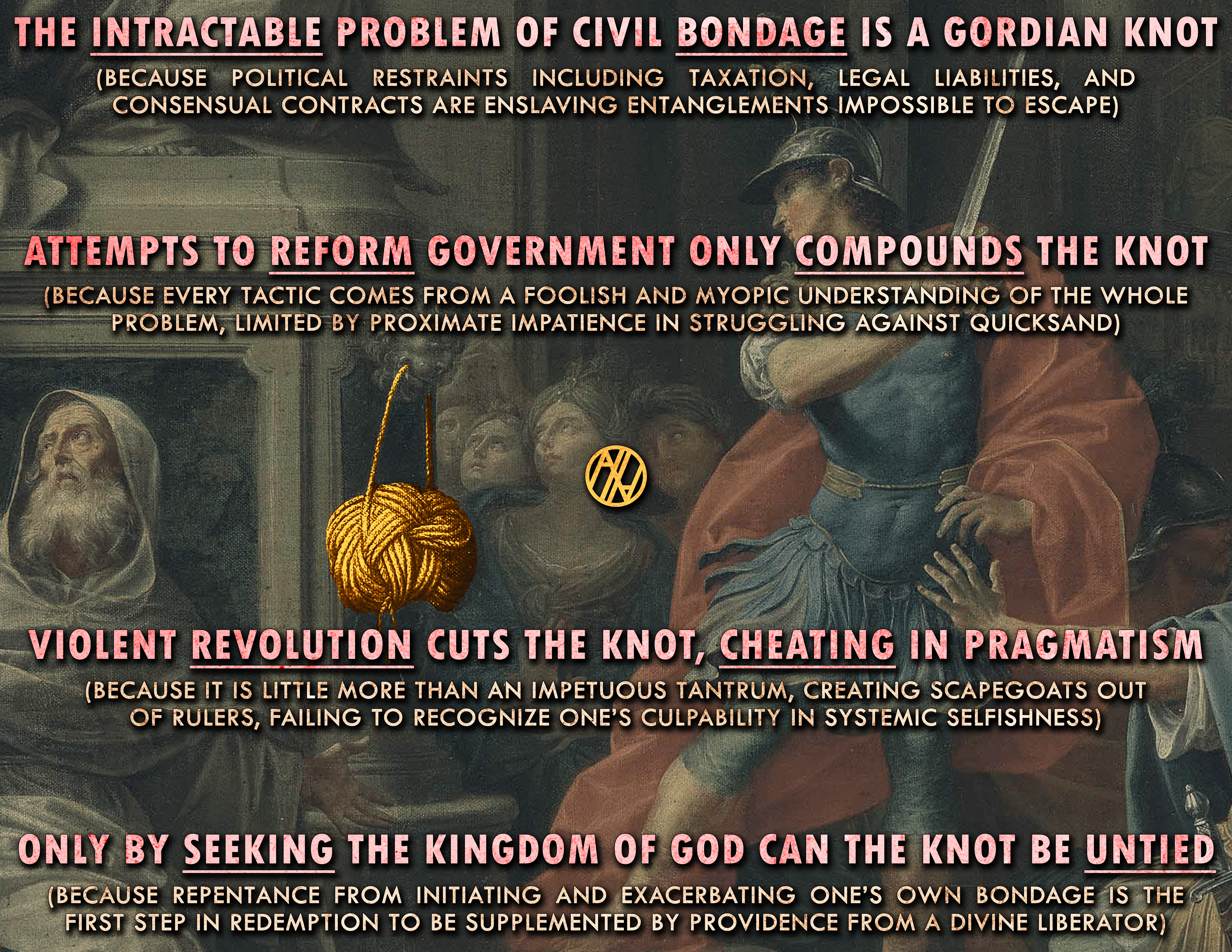However, most people who convince themselves that they love freedom, including many professing christians, have already been given over to a reprobate mind to frequently commit to that which is inconvenient in their search for convenience. They are endeavoring to traverse, without a guide, the mire of their own judgment, and untangle, by their own understanding, the Gordian Knot that binds themselves and their neighbor.