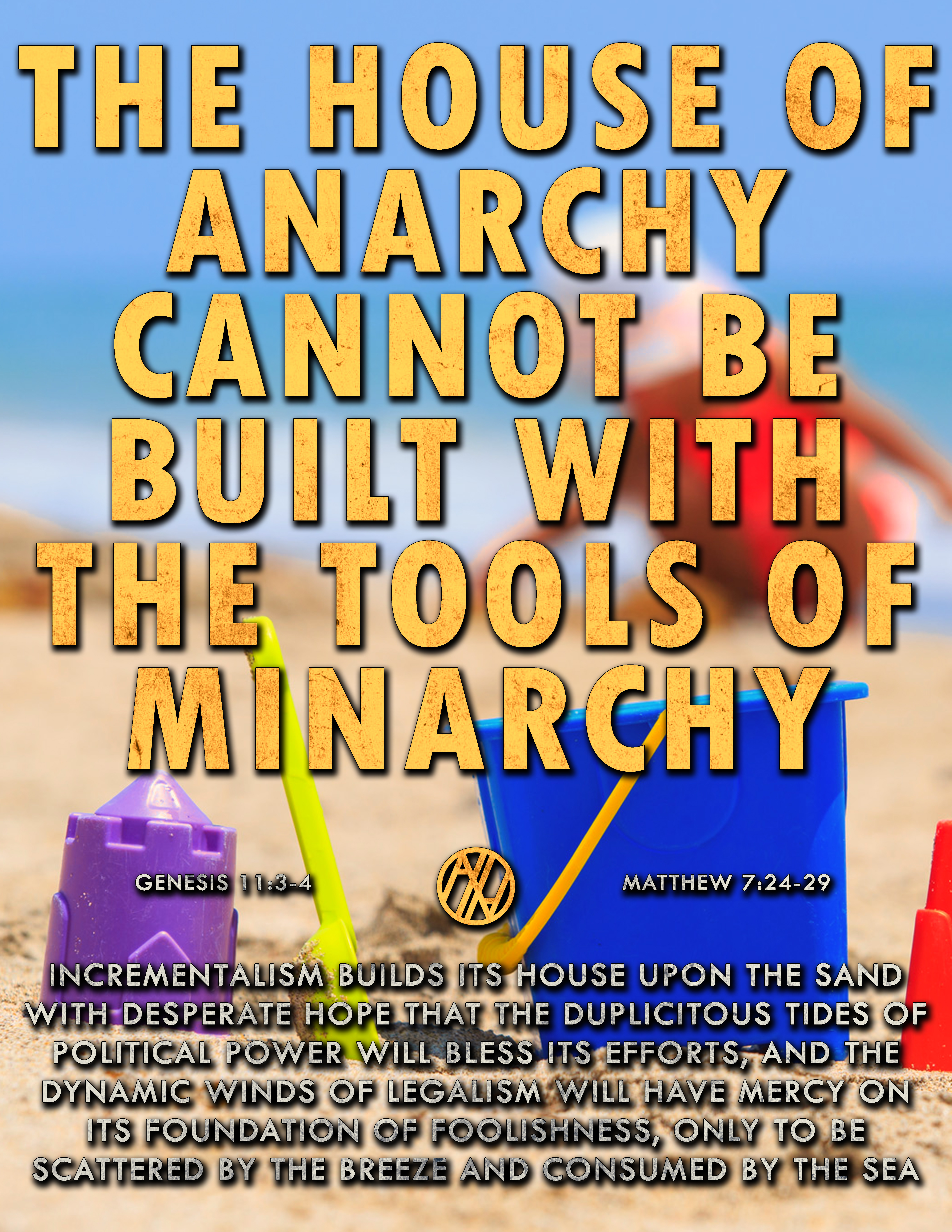 The philosophical conclusion of Incrementalism rests on either one of two premises. The common denominator between these excuses (whether or not they are acknowledged in word and not just in deed) is faithlessness towards the Promises of God for those who seek His Righteousness by seeking His Kingdom. But these two premises should be recognized by either the first premise: the idea that institutions of human authority, while evil, are a necessary evil, either to provide roads, or justice, or order, or benefits, and that this minarchism can be utilized so that “good may come,” or by the second premise: the idea that institutions of human authority are impossible giants to overcome, and that progress can only be tempered with conciliatory cowardice with which to supplicate to them, because Liberty is only a distant and unreachable dream, nebulous and impractical in the face of defeatism.