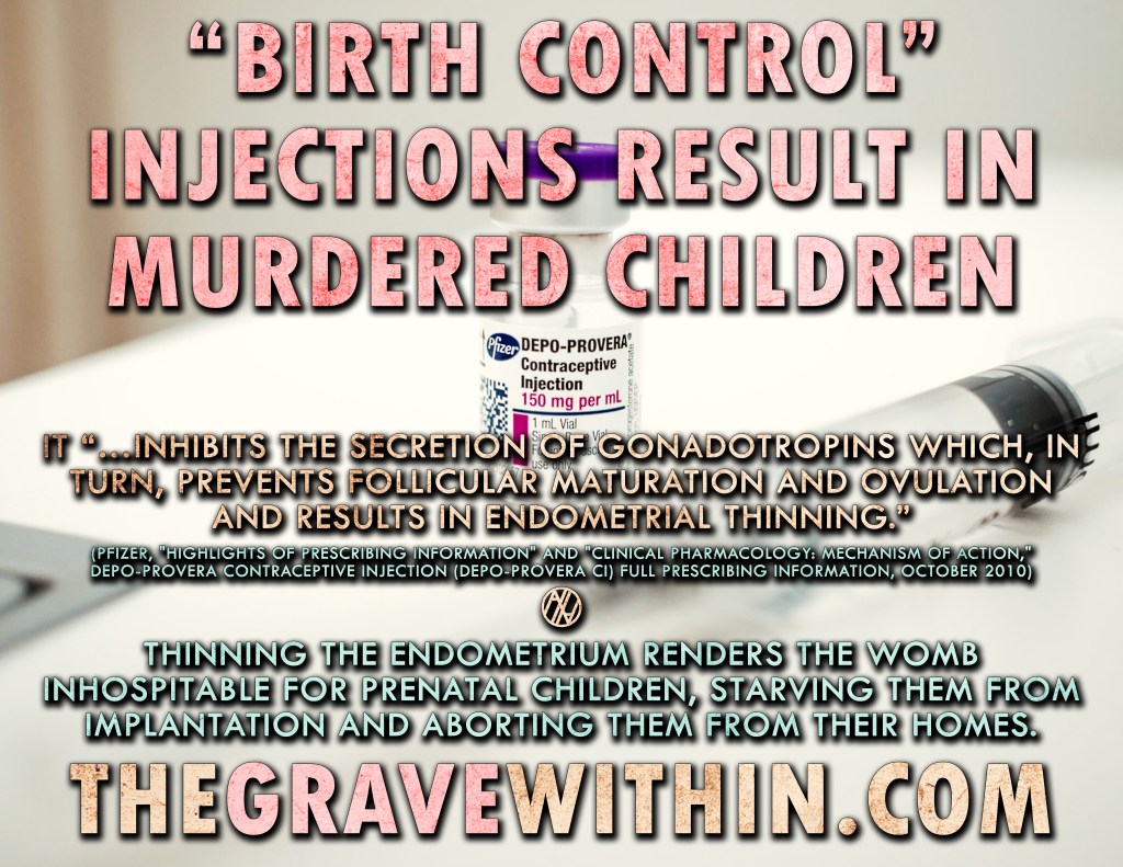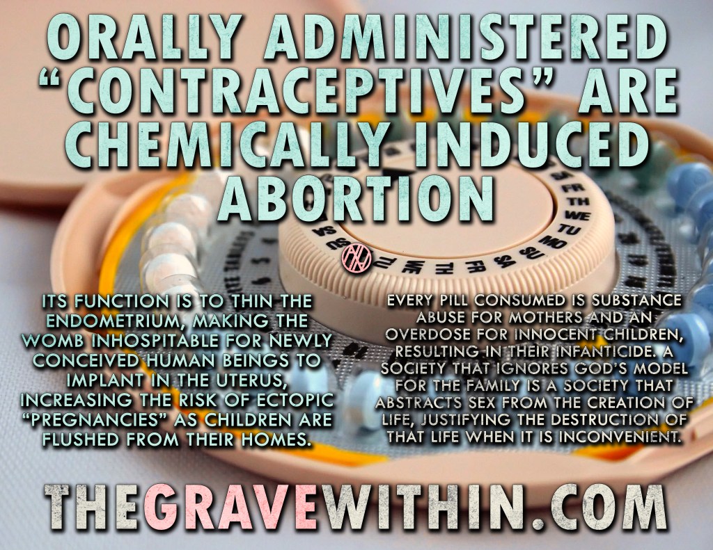 Therefore, birth control kills children made in God’s image, of the flesh and blood of the mother who is administering birth control and of the father who fails to disallow its use. “Preventing pregnancy” in this case means abandoning the child downstream on a river of blood, starving him to death by preventing him from ever making the initial attachment to his mother’s womb. This reality applies to every form of hormonal birth control and chemical contraception.