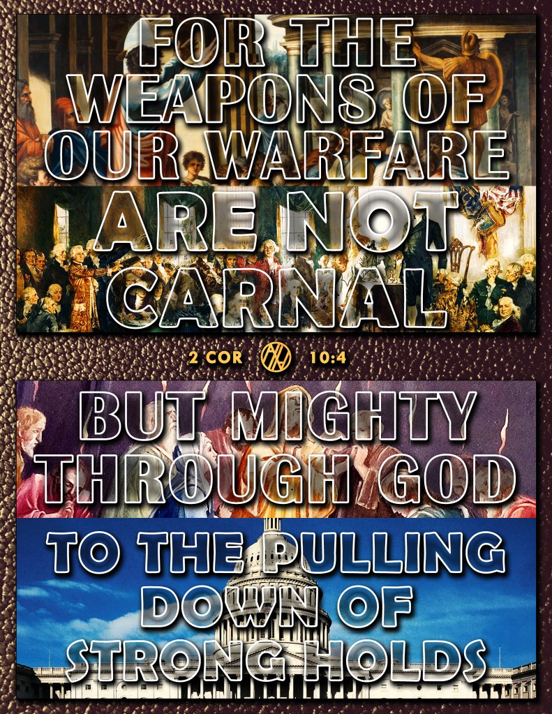 The “strongholds” mentioned in 2 Corinthians 10 do refer to the human institutions with which the early Christians were notoriously in conflict, but that conflict was vindicated by the Providence of God which allowed them to completely abdicate from using their existing power centers or seeking to replace them with their own administrations. It is not as though a literal sword or weapon for self-defense debases its user to be carnally minded any more than a spoon does for eating or a car does for traveling.