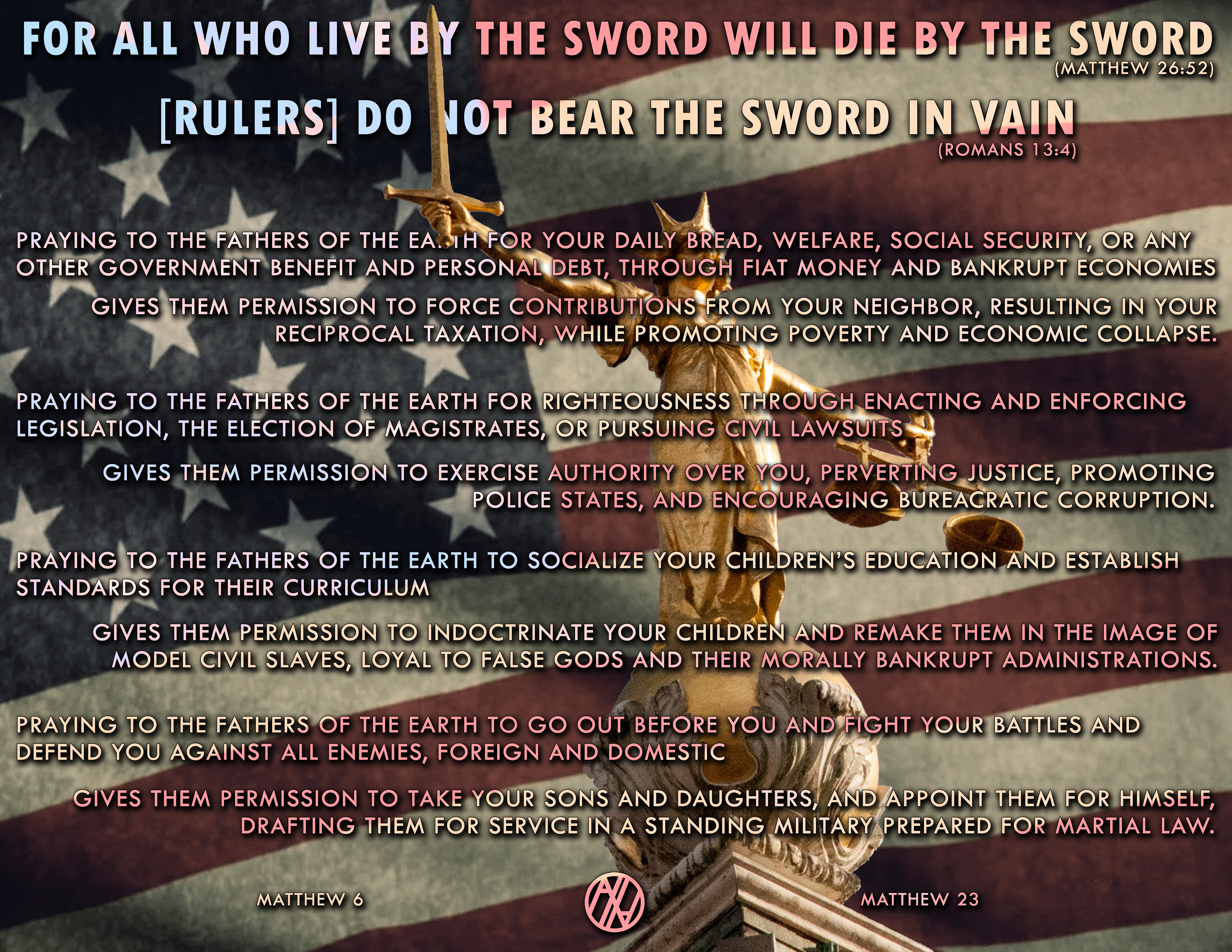 This lesson is further expounded upon in the injunction to “resist not evil” in refraining from civil retaliation when subject citizens of pagan nations take free men in God’s Kingdom to their pagan courts for whatever reason. To make these sentiments about self-defense is to misunderstand that Christ is speaking on a specific method of “resistance” which is retaliatory, referring to the same force, warfare, and institutionalism that are themselves evil. Voting or electing magistrates “in self-defense” is evil because outsourcing the concept of “self-defense” to socialist institutions only legitimizes the original use of them against you in pragmatism.