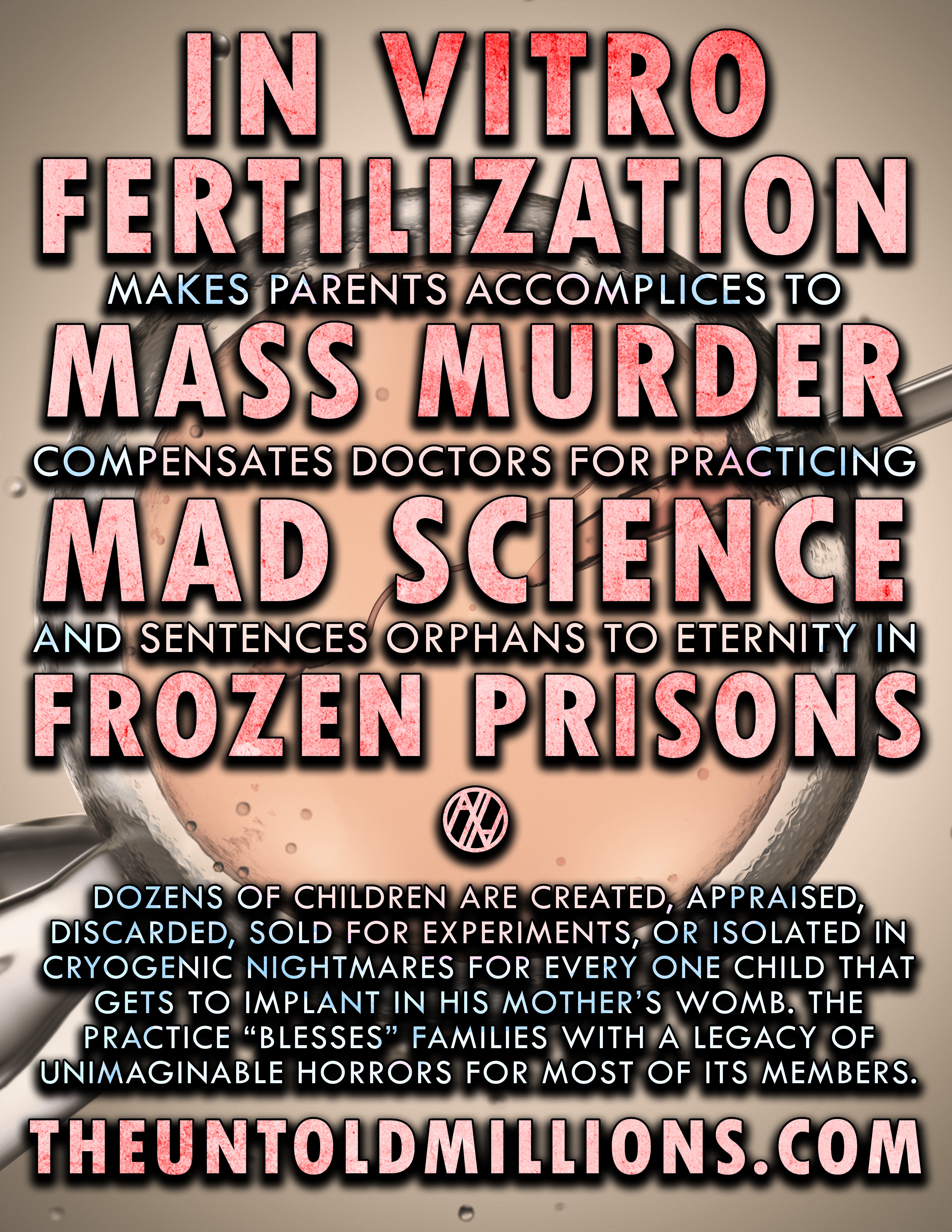 Roughly 625,978 children were murdered by surgical abortion alone in 2021. 4,665,392 children suffered under IVF in the same year. Of course, neither encroach on the insurmountable tally of children discarded in hormonal contraception. Which method is killing more children? Which method is more palatable to the culture? About which method are Christians not only more apathetic, but are happily engaging in and citing as “God’s blessing?” If you can be persuaded of anything here, let it be that Abortion and IVF are absolutely of the same branch of evil.