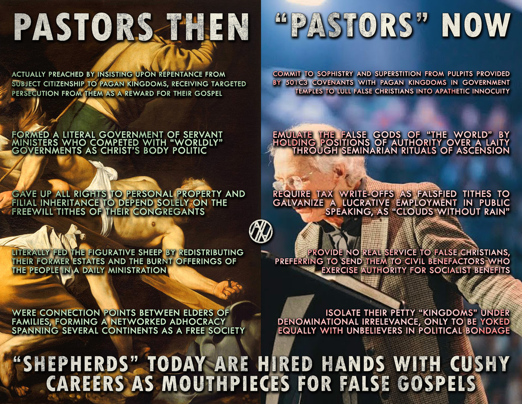 “Pastors” aren’t meant to be institutionalists that attend seminaries for formal education, so that they can make a profession out of eisigeting Scripture in order to lead an army of pew-people in ritualistic sing-song, while offering tax-write offs for their tithes in fiat currency. These men do try and model themselves after human civil government though since their 501c3 buildings are incorporated, not under Christ, but the attorney General.